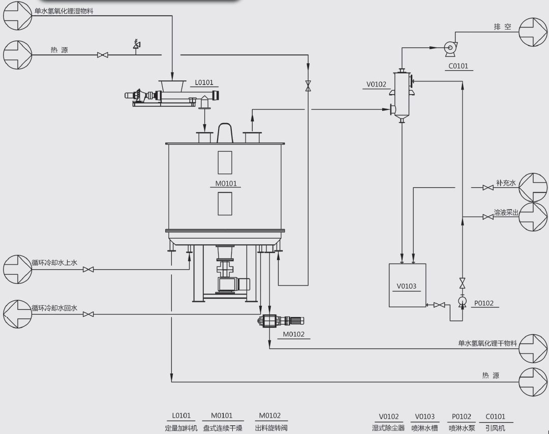 工艺简介:由前道工序输送过来的单水氢氧化锂湿料,由定量加料器连续定量地加入节能环保型盘式连续干燥机内进行干燥作业,物料在流动过程中完成传热传质过程,达到干燥的目的。干燥物料在干燥机内经冷却达到包装温度后(一般在50℃左右)由底部的排料口经过出料旋转阀排出进入下一道工序,从物料中逸出的尾气由设在干燥机顶部的排湿口经专用除尘器除尘后排出。